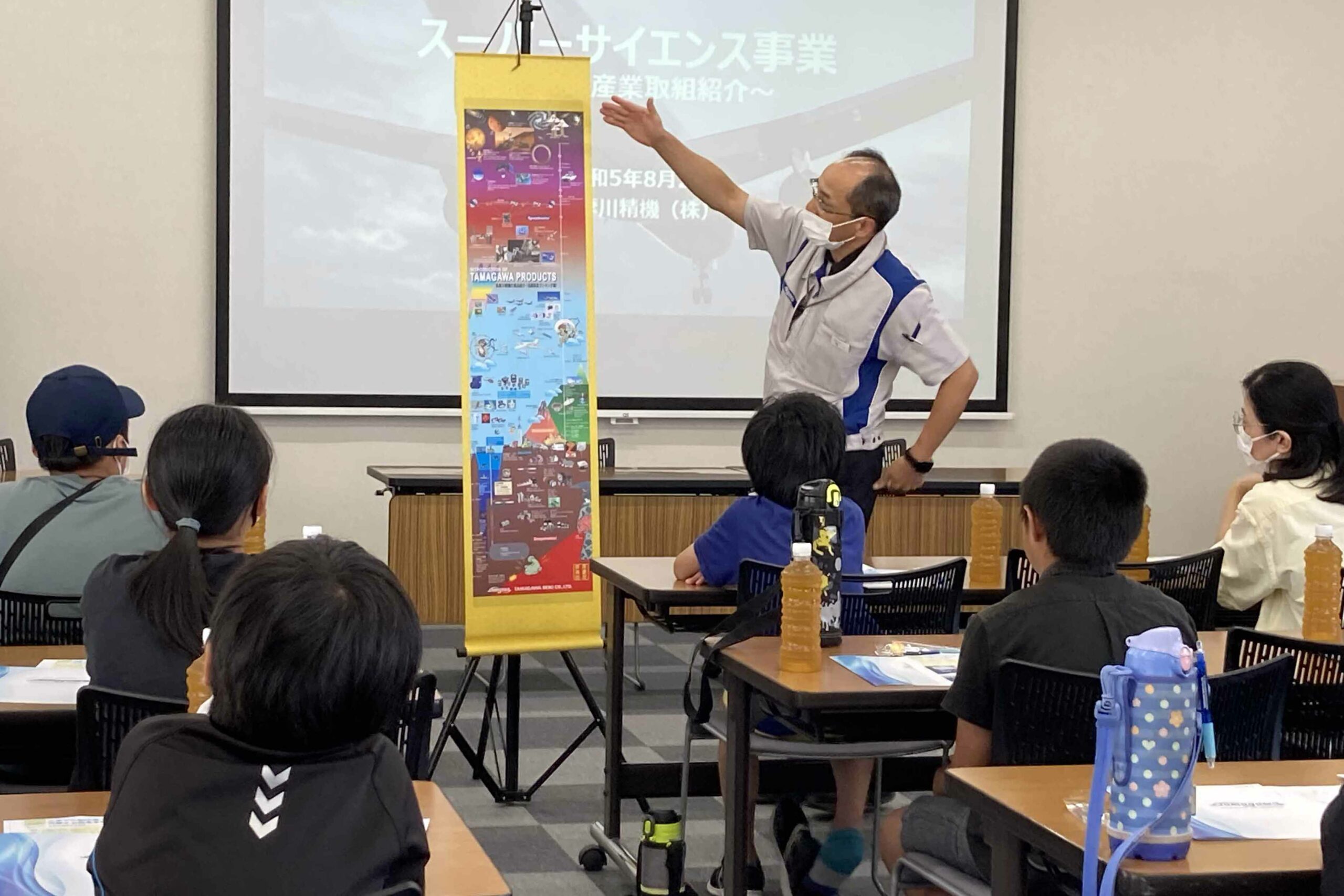 飯田市では市内の小学生を対象にしたスーパーサイエンス事業を実施しており、今年は飛行機が飛ぶ仕組みやこの地域における航空機関連産業への理解を深めてもらうことを目的として、8月2日、小学生11名とその家族9名が当社を見学しました。