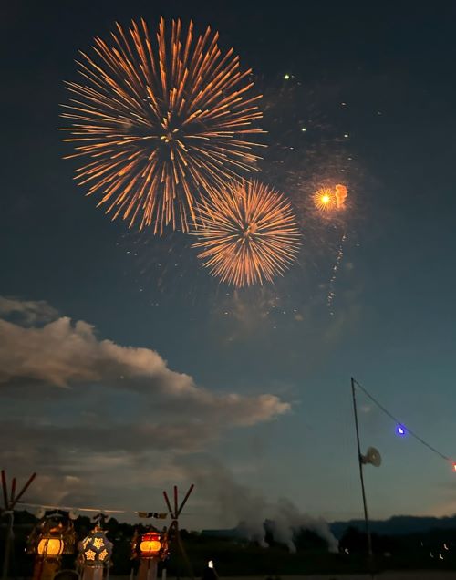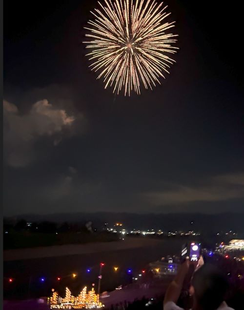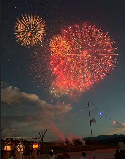 新盆供養として昭和初期に始まった飯田の夏の風物詩であり、家族や先祖への思いを込めた約250基の灯ろうを天竜川に流すとともに、スターマインや尺玉など約2,000発の花火が夜空に打ち上げられました。