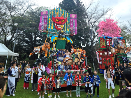今回は、5年ぶりに国道104号で山車を運行。後町内会(題名:車引(くるまびき))と下町内会(題名:清正大虎退治(きよまさおおとらたいじ))の2つの町内の山車が登場しました。また東北フリーブレイズの選手が引き子として参加したほか、小学校のブラスバンド部、神楽、流し踊りなどが山車とともに沿道を賑わせていました。