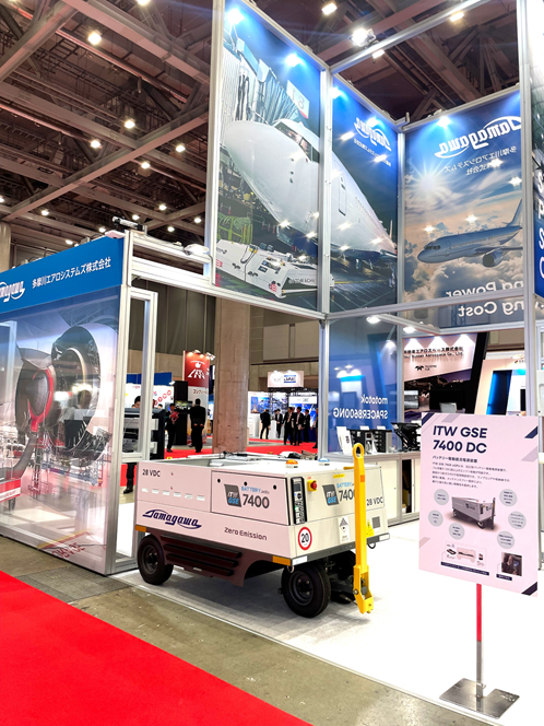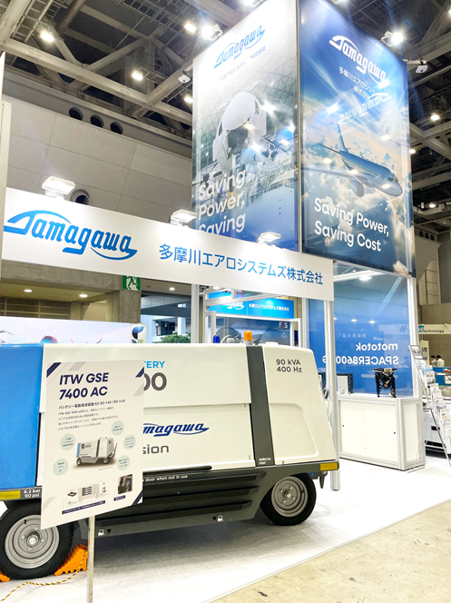 多摩川エアロシステムズは航空機用バッテリー駆動電源装置(ITW GSE 7400 eGPU)やプッシュバックトラクター(Spacer 8600NG)、ジェットエンジン冷却装置(FCS Finland)、空港ランプ用無線通話装置(Airlink 2085)などを展示。プッシュバックトラクターのデモンストレーションでは、どのように車輪を固定し航空機を後退させるのか紹介し、大人から子どもまで多くの来場者の注目を集めました。