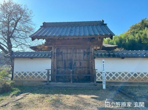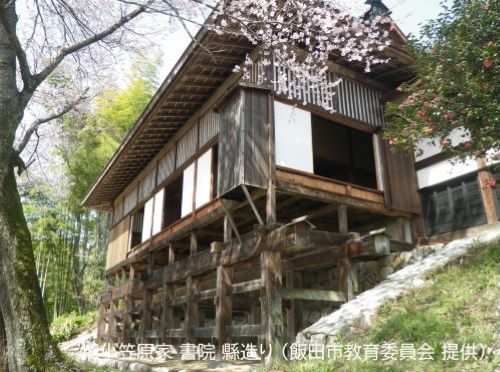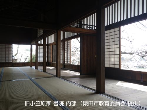 1600年(慶長5年)に徳川家康から小笠原長巨(おがさわら ながなお)が伊豆木(現在の長野県飯田市伊豆木)に千石を賜り、小型の城郭をなす居館を構え居住し、その後1872年(明治5年)の帰農に際し、書院と玄関のみを残して建物が取り壊されました。書院は1624年(寛永初年)頃に小笠原長巨が建立。「田」の字型に四つの部屋で構成されており、当時は接客に使用され居館の中でも最も重要な建物でした。豪放な大菱欄間や北側の大床、南側床下の崖からせり出した縣造りも含め、近世初期の豪族の邸宅を示す貴重な遺構として、1952年(昭和27年)3月に玄関とともに国の重要文化財に指定されています。