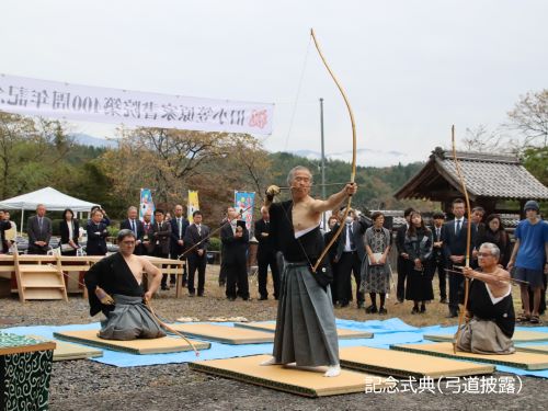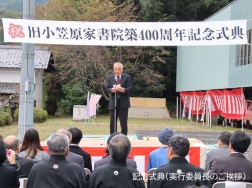 今年、この書院が築400年を迎えることから、地元の三穂まちづくり委員会が組織する旧小笠原家書院築400周年記念祭実行委員会が主催となり、「旧小笠原家書院築400周年記念祭」を開催しており、10月26日には記念式典が開催されました。この式典では、コロナ撲滅を祈願した弓術演技のパフォーマンス、飯田市美術博物館・織田副館長による小笠原氏に関する記念講演、そして鯖寿司や記念手ぬぐいの販売などが行われました。