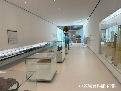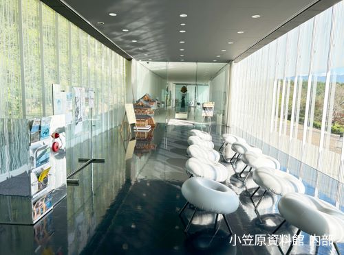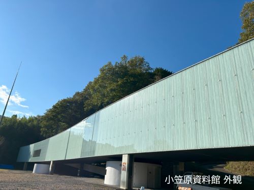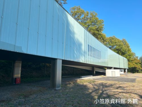 書院の向かい側に建つ小笠原資料館は、妹島和世と西沢立衛の建築家ユニット「SANAA」(2010年にプリッカー賞を受賞)の設計で、1999年(平成11年)に竣工しました。壁面には幅広くガラスを使用し書院を上からの角度で見渡せ、建物裏側の法面に沿って長く緩やかに湾曲した形状や6本の柱で支えている構造は建築的に非常に珍しいものです。この資料館には伊豆木小笠原家の系譜図、歴代の花押、鎧兜、陣笠、刀、矢など、伊豆木の地を治めた豪族・小笠原家を知る上で貴重な資料が展示されています。