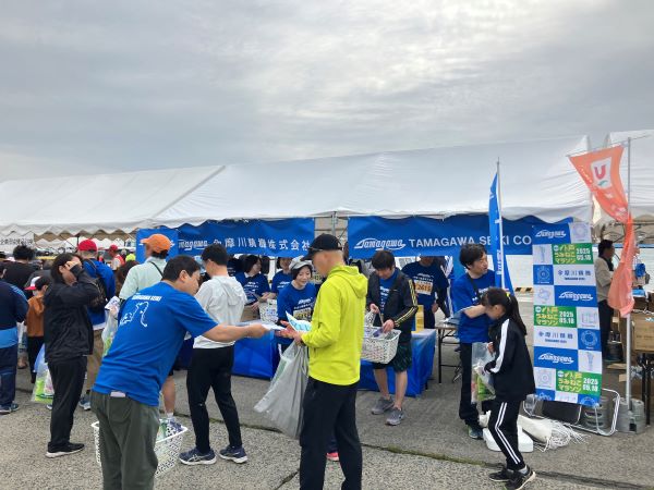 当社は特設会場でブースを出展し、ドライフルーツを来場者に配布しました。また、「3kmタイムなし」の種目へのぼりを持って参加したほか、5km、10km、ハーフマラソンに健脚自慢の社員が出場。社員それぞれが初夏のマラソン大会を楽しむことができました。