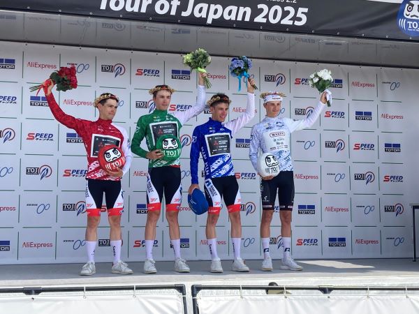 写真左下:表彰式の様子。ステージ優勝はシモーネ・ラッカーニ選手(グリーンジャージ)