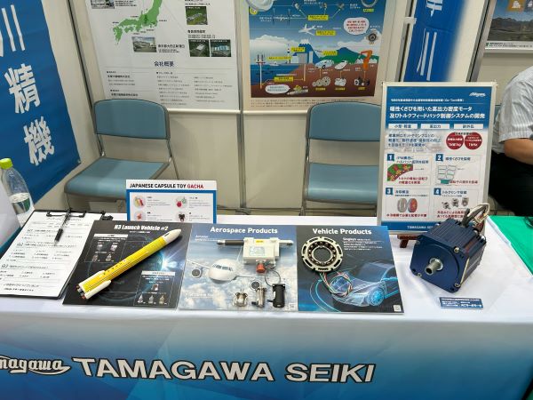 当社ブースでは、Go-Tech事業(令和6年度成長型中小企業等研究開発支援事業)で開発中の「磁性くさびを用いた高出力密度モータ」のほか、航空機、宇宙、自動車の各分野でどのような製品を開発しているのかを分かりやすくプレート化したディスプレイを展示しました。また、飯田市の伝統工芸品である「水引」で作った小物を、子どもたちを中心にガチャガチャでプレゼントしました。