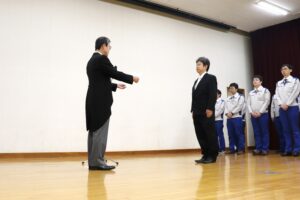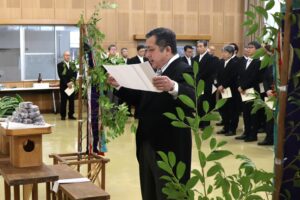 神社祭の後、永年勤続者や職務上の功績を称える表彰式を実施。宇宙向け製品の開発・製造、長年にわたるお客さま向けセミナーの開催、特許の取得などに携わった社員・部署が表彰されました。